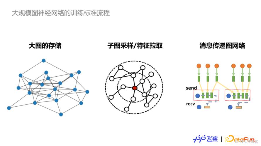 图神经网络大规模的训练,目前是有一套比较成熟的标准流程。特别是大图的情况下,我们通常会沿用 2017 年的一篇论文叫做 GraphSAGE,它主要的理念就是训练在大图里面的某些带标签的节点,我们通常会对某个点的邻居进行采样 sample,后面用 aggregation 就是不停地聚合或者通过消息传递的图神经网络去代表我们中心的一个点。对于不同的框架,我们都会主要解决三个问题,第一个是我们的图是怎么存的,第二个是我们的子图是怎么采样,包括一些特征是怎么从图里面拉取出来。最后是高层图网络的一些消息传递算法是怎么定义的。
