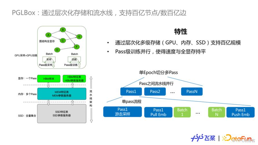 如果业务再大一点,就是我们的图可能再大到百亿点或者百亿边以上的规模,我们也提供了另外一种层次化的策略,就是把我们的整一个大图存到一个 SSD 以及内存上面去,当我们使用到一个训练的时候,再把对应的东西挪到显存里面去。这里的图表示学习训练我们做了一系列采样的情况下,通常我们训练的一块它是很集中的,就集中在某一块的子图。所以在这里我们就引入了一个叫 Pass 的一个概念,就是我们一个 epoch 可能要把整个图游走,全部的点给遍历了一遍。但是我们的一个 Pass 就是把整一个 epoch 把它拆成若干个小的 Pass,在 Pass 里面做样本的游走,以及参数服务器的一些特征的准备。准备完了之后,这一块就很适合直接在显存里面做。那么在显存里面我们就一直训了 N 个 Batch,把这整个 Pass 训练完之后,我们再把对应的一些 embedding 以及吸收的一些参数同步到一个 SSD 以及内存的参数服务器上面去。不同的 Pass 之间,我们可以做一个流水线的并行。就例如我们在做 pull embedding,从内存去拉取对应的一个 embedding 的时候,第二个 Pass 的游走的采样以及样本的生成和分析已经可以做了。所以通过这样的一个 Pass 级的一个训练并行,尽管我们引入了这些层次化的存储,速度也是跟全显存的模式能做到一个持平的效果。