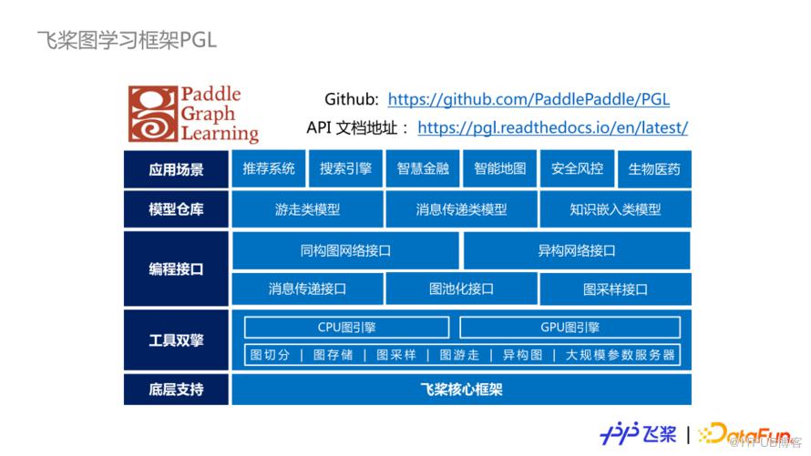 上图是我们的一个图学习的框架 PGL。大概是在两年前发布的,主要是基于飞桨的 PaddlePaddle 深度学习框架,在上面搭建了一些包括图的引擎,以及图网络的一些编程的接口,上面我们也放了很多预置的模型,供大家去使用。感兴趣的同学可以去我们的Github,可以 pip install 装我们的框架,以及跑一些示例。
