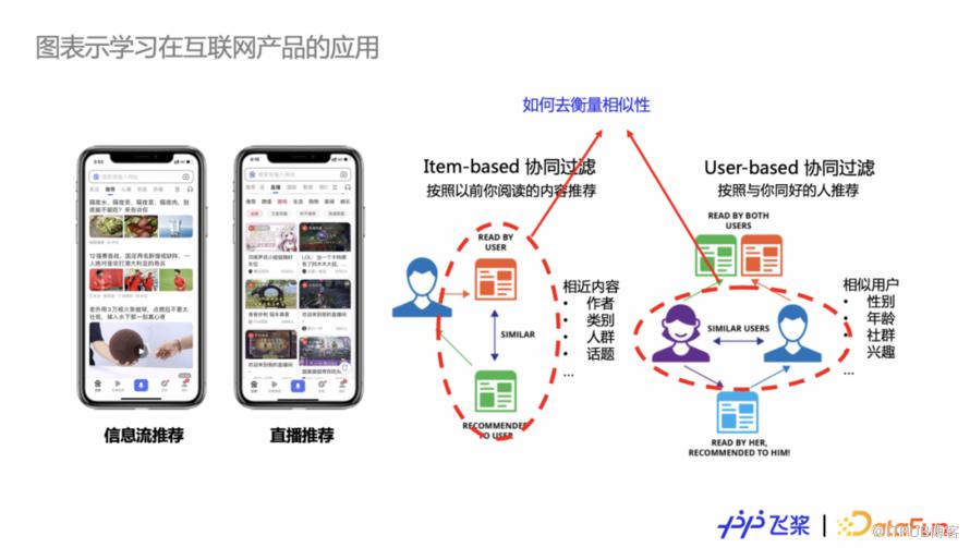 在工业界的场景,特别是互联网的产品应用,我们在做推荐的时候,通常会面临一个事情,就是对我们的用户以及物品去建模。推荐里面有两个常用的算法,一个是 Item-based 协同过滤,就是去衡量两个物品之间的一些相似,以及 User-base 协同过滤,就是去衡量两个用户之间的相似度。