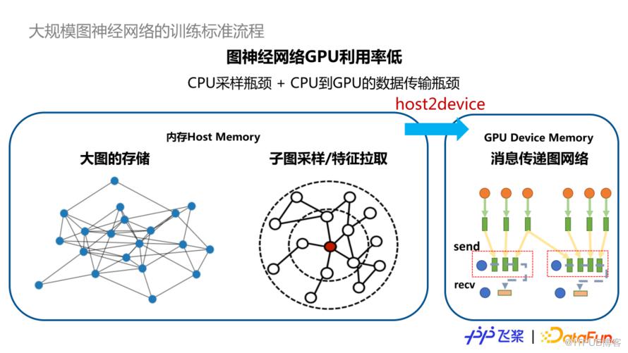 相比于一些大模型,在图网络里面大部分的消耗反而是在图的存储以及特征的拉取上面。比起刚刚说到的一些大模型参数量上,目前模型在纯网络的模块是会比较小的,但即使在这种情况下,我们的图神经网络训练的 GPU 利用率还是很低的。最大的瓶颈就在于 CPU 上图的采样的瓶颈,以及我们从 CPU 到 GPU 的数据传输的瓶颈。因为我们的图很大,所以通常情况下 GPU 是存不下来的。我们会把图和一些采样的算法实现在内存,最后采样完之后,我们再把它挪到我们的 GPU 去做计算。