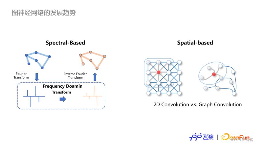 图神经网络这个概念也是在近年来比较火的。之前在建模图的时候,通常会基于一个谱域的概念,就是一个 Spectral-based 的方法。会首先把一些图通过傅立叶变换转化到频域,再去频域上操作。当时可能是因为这个理念比较复杂,并且它对于大图的扩展性比较差,所以关注这方面工作的人比较少。大概在 2017 年左右,像图卷积网络,还有一些像 Message Passing 的网络出现之后,大家会转向用更简单的架构去看待图网络,例如 Spatial-based 的方法,就是在空域上去理解图神经网络。我们可以类比到二维的图卷积里面去,如果你要建模一个点的元素,它是跟你周围的像素有关的。在图神经网络里面的话就是如果我要建模一个点、它的一个属性以及表示,通常只会跟它的邻居有关,然后就通过一些邻居的计算,我们就可以得到我们中心节点的一个表示。
