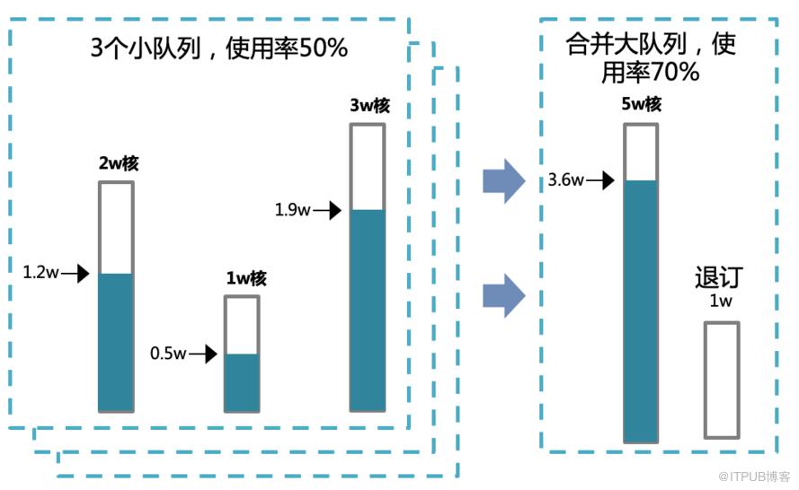 接下来大致粗略的说一下合池的过程,如下图所示:就是将等量资源的几个小队列进行合并,提升队列的使用率上限,满足业务需求的同时退订一部分资源。