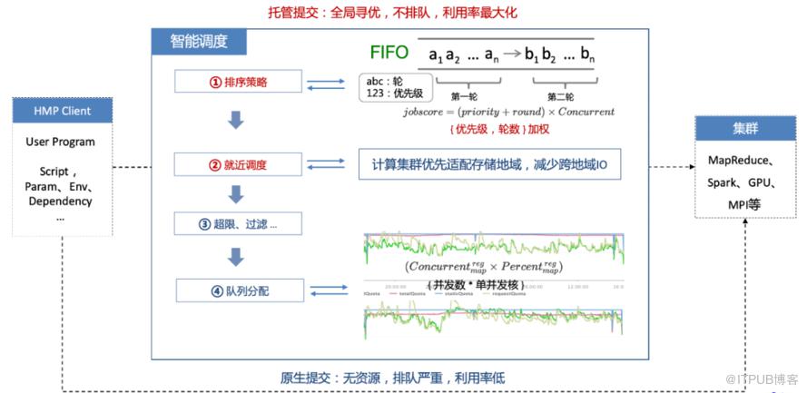 如下图所示,智能调度的整体架构如下,首先一个基于python的client,负责将用户的程序、参数、环境依赖等等进行打包,然后通过智能调度系统异步提交,系统会根据任务维度多维的特征,比如优先级、并发、所需资源等信息结合资源实时的水位进行智能最优匹配,其中调度系统比较核心的也是首要的就是排序,即要解决先调度谁后调度谁的问题,如下图中的排序策略,首先是一个FIFO的队列模型,排序策略会根据任务的优先级、等待轮数进行加权,然后结合任务的并发系数进而计算出来先后顺序,优先级分位三挡,VERY-HIGH、HIGH、NORMAL,优先级越高权重越大,其次是等待的时长越长权重越大,越优先调度;有了顺序后后面会根据任务要读取数据的地域就近匹配计算队列,减少跨地域网络IO的开销,此外还有队列资源打满或异常等过滤策略,以及任务使用资源超限降级等策略,最后是针对排好序的任务进行队列分配,根据实时获取的队列资源水位结合任务提交所需要的资源量(并发数*单并发核数),分配好队列,任务会被worker正式提交到集群上面去。智能调度在整个合池过程中充当非常重要的角色,它能保障任务在合池后性能不退化,通过合理的编排,针对峰谷不一的资源进行打平调度,重复利用闲散资源提升整体资源利用率。