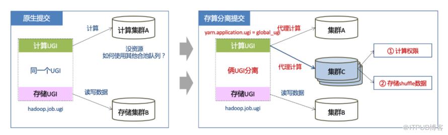 接下来介绍下算力优化的第一个优化点,合池技术,首先说下为什么要合池,因为碎片化的队列会导致弹性不足、使用率很难最大化,维护成本高。如下图所示,一个大约5w核的队列,它的峰值是达到上限了,但是均值很低,很难满足更大资源量但是执行较快的需求,因此一方面是期望能把小的这种队列合并,另一方面提升整体的使用率,如下图第二个队列,最终实现降本增效。