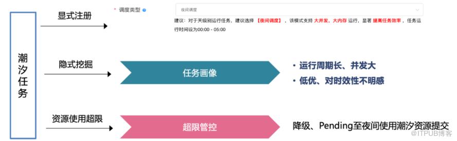 接下来我介绍下算力优化的第二个优化点,潮汐,它的特点是体量大、数百万核、夜间特定时间段供给,成本低,免费用。可以用潮汐技术的场景包括策略模型调研类,数据回溯类等。如何把这部分资源充分利用好是项目的核心,主要通过如下三种方式实现潮汐的规模化应用,第一是显式的注册引导,第二是对存量可在夜间运行任务的画像挖掘,第三是对资源使用超限的分时管控,如下图所示: