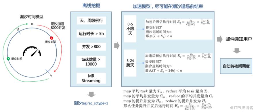 下面介绍一下潮汐的第二个技术点,也即是前面提到的另一个挑战,如何保障潮汐任务瞬时退场后不失败,第二天潮汐窗口来临后继续跑,解决方案是在现有的合池队列上进行扩展,在潮汐退场前提前降低并发,白天低速运行。
