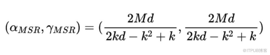 MSR全称为最小存储再生码Minimum Storage Regenerating码,不难理解,MSR是保证了存储消耗最小,所以MSR的存储数据块大小和失效修复带宽值计算公式如下: