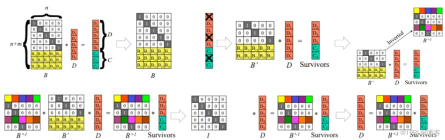 这样就有了经典的(A Performance Evaluation and Examination of Open-Source Erasure Coding Libraries For Storage)描述Reed-Solomon码的编解码方式如下图所示: