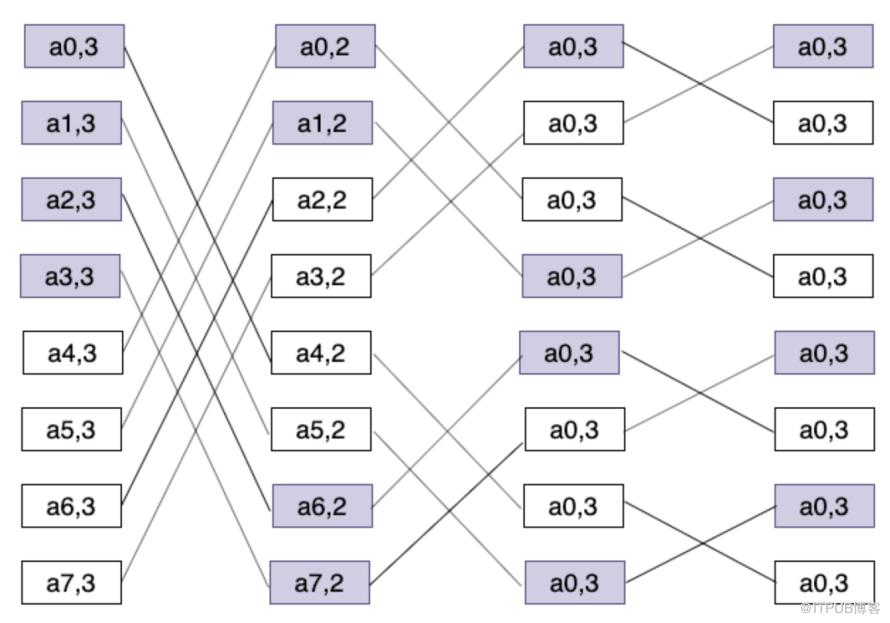 butterfly是FAST 2016年的一篇论文提出的编码算法,最多可校正2个节点故障的数据丢失,算法只涉及XOR操作,性能较好。节点故障后只需要所有节点的1/2数据参数修复。由于编码操作用线相连对应符号位看起来像蝴蝶一样,如下图所示,所以取名butterfly code。
