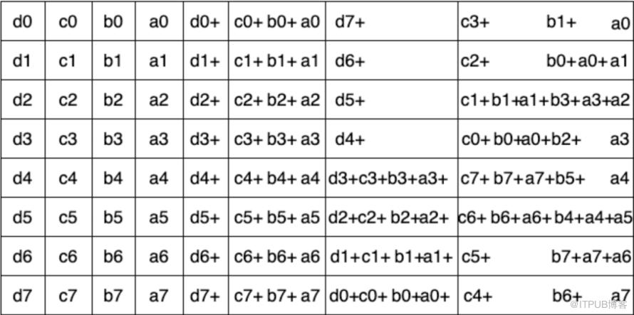 我们假设局部校验块P1、P2、P3、P4的构造按如下所示: