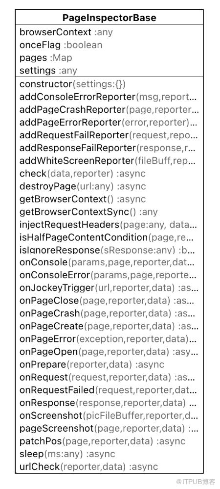 PageInspectorBase(页面检查器基类): check():检查器入口,用来打开指定的检测页面,并初始化各种资源的监听; injectRequestHeaders():注入页面接口请求需要的cookie、token等; urlCheck():url地址检查; onRequest():监听页面请求; onResponse():监听页面响应; onPageError():监听页面错误;