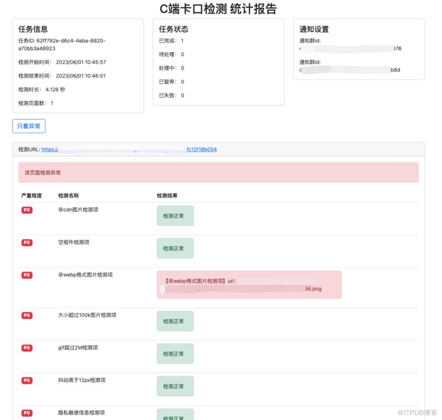 // 页面检测类class PageInspector extends PageInspectorBase { // ... // 针对不同资源类型检测方法配置Map checkResponseMethodsMap = new Map([['image', this.checkImageResponse]]) // 请求资源型检测入口 针对请求资源进行检测 async onResponse(response: Response, reporter: PageReporter, data: IJobItem) { const resourceType = response.request().resourceType() const checkMethod = this.checkResponseMethodsMap.get(resourceType) await checkMethod(response, reporter, data) } // 检测图片资源 async checkImageResponse(response: Response, reporter: PageReporter, data: IJobItem) { // ... if (imageCdnList.includes(url)) {reporter.add({ errorType: "图片类型错误.非cdn资源" })} // ... } // 运行时检测入口 在页面打开时执行注入的js脚本进行运行时检测 async onPageOpen(page, reporter: PageReporter, data) { // ... const htmlText = await page.evaluate('window.document.documentElement.innerHTML') const phoneRegex = /\b((?:\+?86)?1(?:3\d{3}|5[^4\D]\d{2}|8\d{3}|7(?:[35678]\d{2}|4(?:0\d|1[0-2]|9\d))|9[189]\d{2}|66\d{2})\d{6})\b/g; let phoneMatch: RegExpExecArray let collectMessage = [] while ((phoneMatch = phoneRegex.exec(html)) !== null) { const phone = phoneMatch[1];collectMessage.push(`手机号码:${phone}`); } collectMessage.forEach(val => {reporter.add({ errorMessage: `敏感信息:${val}`})}) // ... } // ...}4.4 报告与回调