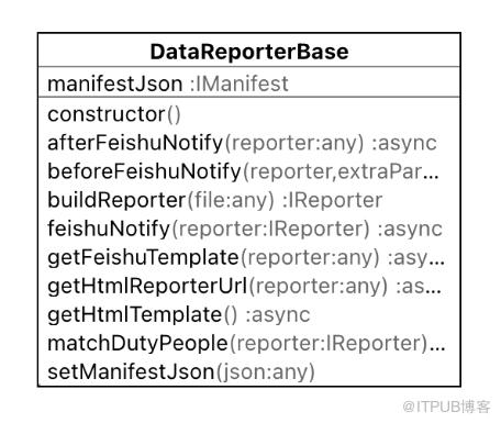 DataReporterBase(数据报告基类): buildReporter(): 根据采集到的错误信息生成检测报告; feishuNotify():将生成的报告通过飞书发送到指定的通知群; getHTMLReporterUrl():根据ejs模板将报告生成html静态文件并上传,返回在线报告地址;
