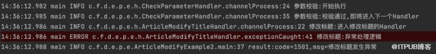 public class ArticleModifyTitleHandler implements ChannelHandler {private Logger logger = LoggerFactory.getLogger(ArticleModifyTitleHandler.class);public void channelProcess(ChannelHandlerContext ctx,Object in,Object out) throws Exception {logger.info("修改标题:进入修改标题的Handler");ArticleTitleModifyCmd cmd = (ArticleTitleModifyCmd) in;String title = cmd.getTitle();//此处的异常用于模拟执行过程中出现异常的场景throw new RuntimeException("修改title发生异常");}public void exceptionCaught(ChannelHandlerContext ctx,Throwable cause,Object in,Object out) throws Exception {logger.error("修改标题:异常处理逻辑");Result re = (Result) out;re.setCode(1501);re.setMsg("修改标题发生异常");}}