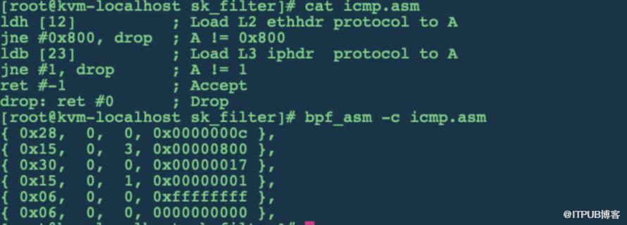 BPF使用起来也比较方便,我们可以通过tcpdump、libpcap或者bpf_asm 生成BPF字节码,通过setsockopt SO_ATTACH_FILTER加载到内核。如下所示实现ICMP报文过滤,只需要根据L2/L3报文头漂移量判断协议号是否符合条件。