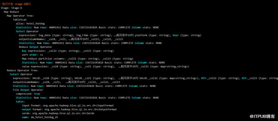 整体的执行计划非常长我们只取 Stage-6 这个阶段,最为关键的是 Reduce Output Operator 这一步