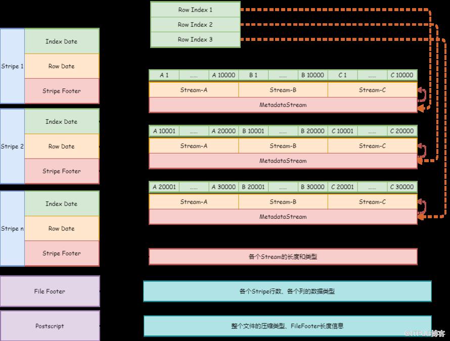条带级 (stripe):该级别索引记录每个 stripe 所存储数据的统计信息;