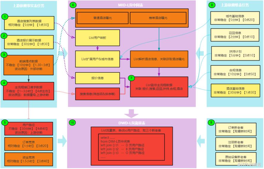 序号①②:L 页的主数据,数据处理的路径通过紫色箭头标识一直到序号⑦,这条路径上游依赖的产出时间为 1 点半左右,可以单独拆分;