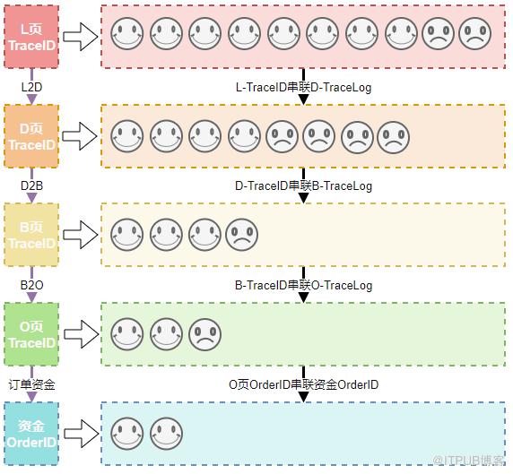 如图我们有十个用户访问了 L 页,其中两个不太满意也就不会进入下一个页面 D 页,也就是我们所谓的流失用户,同样用这两个用户的 L 页 Traceid 是在 D 页的 TraceLog 中找不到。