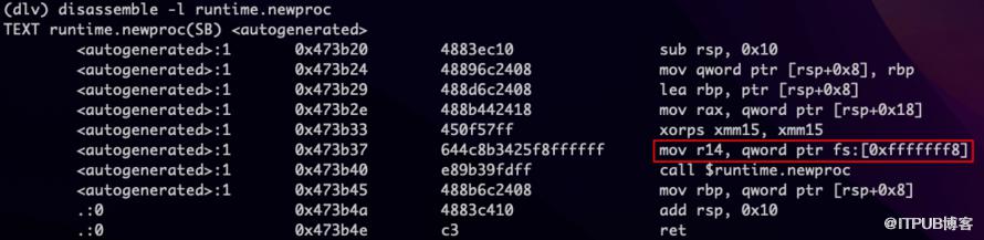 根据函数注释,当前 g 的指针是放在线程本地存储(TLS)中的,调用 getg() 的代码由编译器进行重写。为了找到 getg() 的实现方式,我们看到 runtime.newg 函数中调用了 getg,对它进行反汇编,发现 g 的指针保存在 fs 寄存器 -8 的内存地址上: