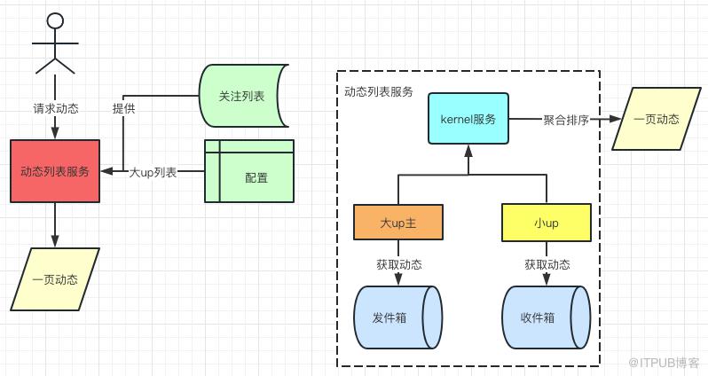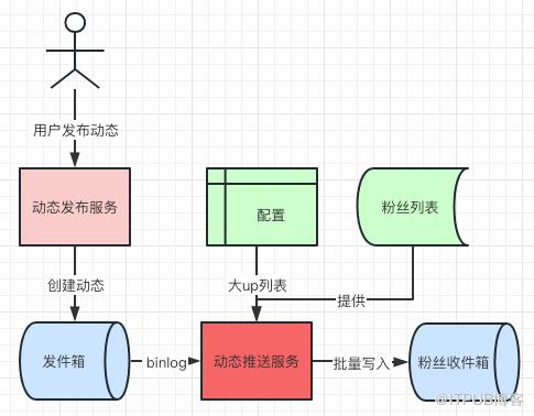 如上图所示,列表服务,根据关注列表与大UP配置,区分大小UP,大UP直接读outbox发件箱,小UP读取收件箱,根据dynID合并成一页。