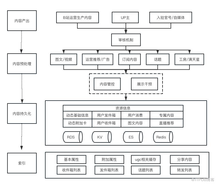 如图2.1所示,总体看,业务范围按照内容生产流程描述,分为4个流程,内容产出、内容预处理、内容持久化、形成索引。覆盖内容收录、编辑、审核、投稿创作端流程,以及投后数据管理、社区氛围管控等流程。