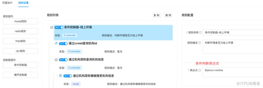 针对我们上面的需求:因为要区分不同环境(测试环境和线上环境),区分不同类型(机构id,机构名称等)所以需要在规则配置中增加条件判断控制器组件,来进行不同条件的判断处理。