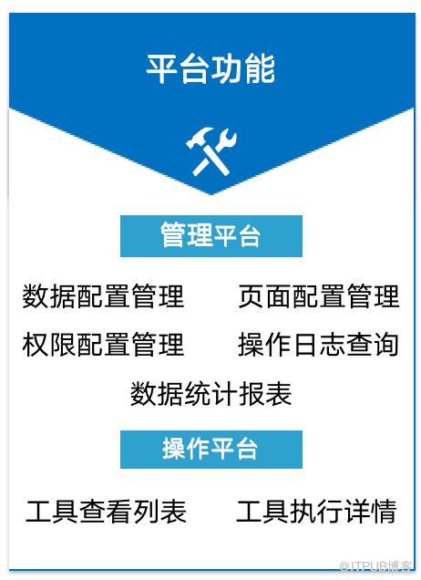 金字塔平台分为管理平台和操作平台,管理平台包括数据配置管理,页面配置管理,权限配置管理,操作日志查询以及数据统计报表等功能;操作平台包括工具查看列表和工具执行详情。