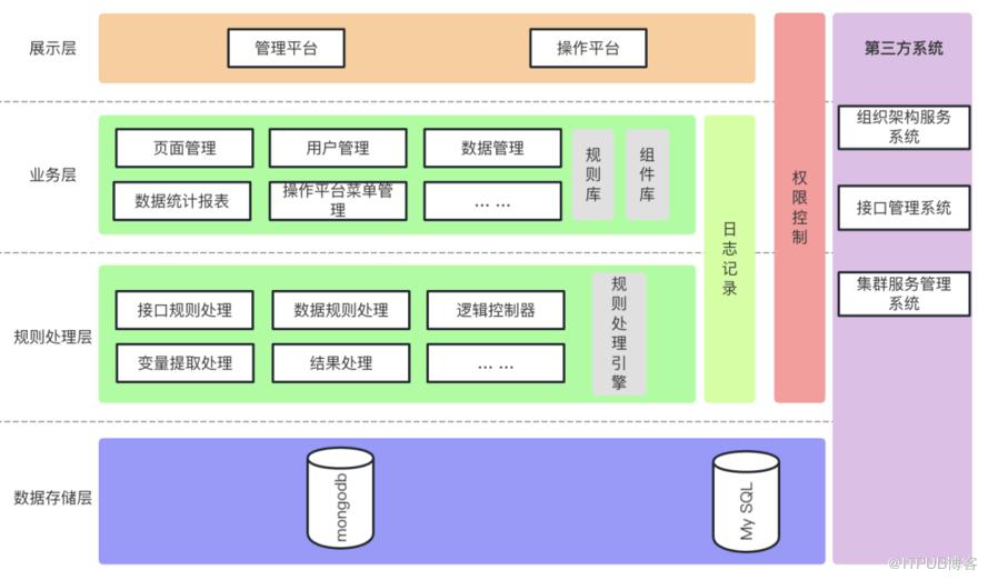 数据存储层,针对规则和页面的数据是存储在mongodb中,方便字段的扩展和解析;日志和权限控制存在关系依赖所以存储在mysql中;