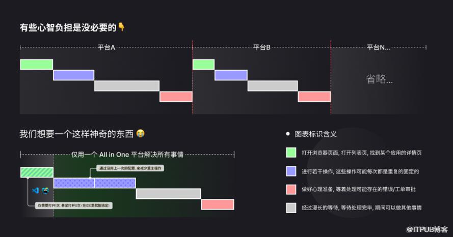 有多少个平台,每新建一个前端应用,就要在这些平台上创建多少次项目,需要投入人力 重复维护 构建脚本、权限管理、元信息等配置,迁移时更会发现项目之间盘根错节,和既有链路耦合起来