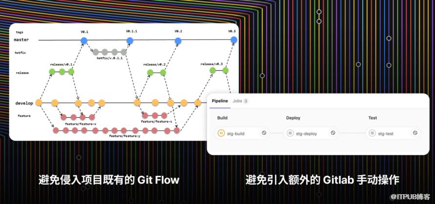 核心就是 仅利用 Gitlab CI 提供的「Pipeline 创建API」作为衔接整条链路的桥梁,允许我们把具有副作用的、需要手动完成的流程前置,把自动化执行的部分后置。