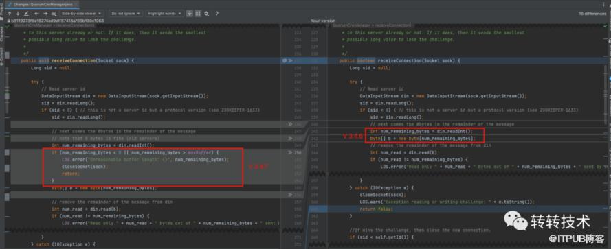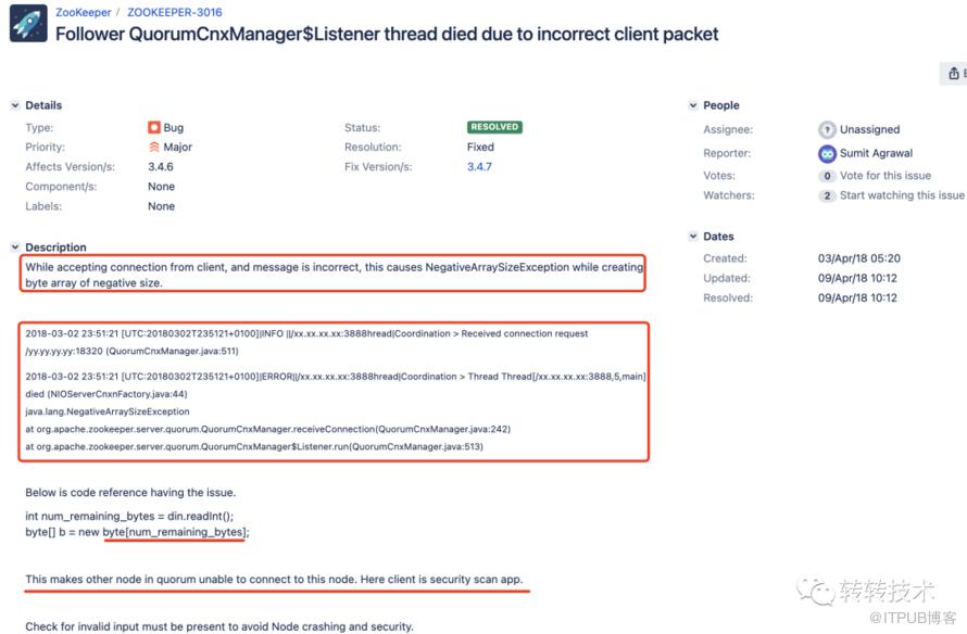 有了这么多信息(QuorumCnxManager$Listener、NegativeArraySizeException等),我们足可以去网上检索求证了。果然,搜索前列即是结论中的issue。那是什么原因导致抛出NegativeArraySizeException呢?