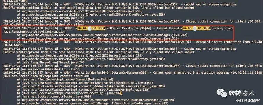 报了NegativeArraySizeException异常,导致3888的监听线程挂掉。在6号jstack下,发现果然没有QuorumCnxManager$Listener线程。