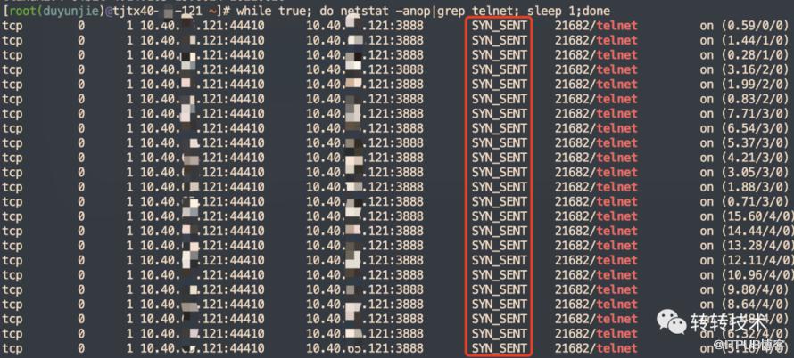 完了,虽然是LISTEN状态,但根本无法建立连接!!!我们再从telnet端用netstat看下TCP连接的情况: