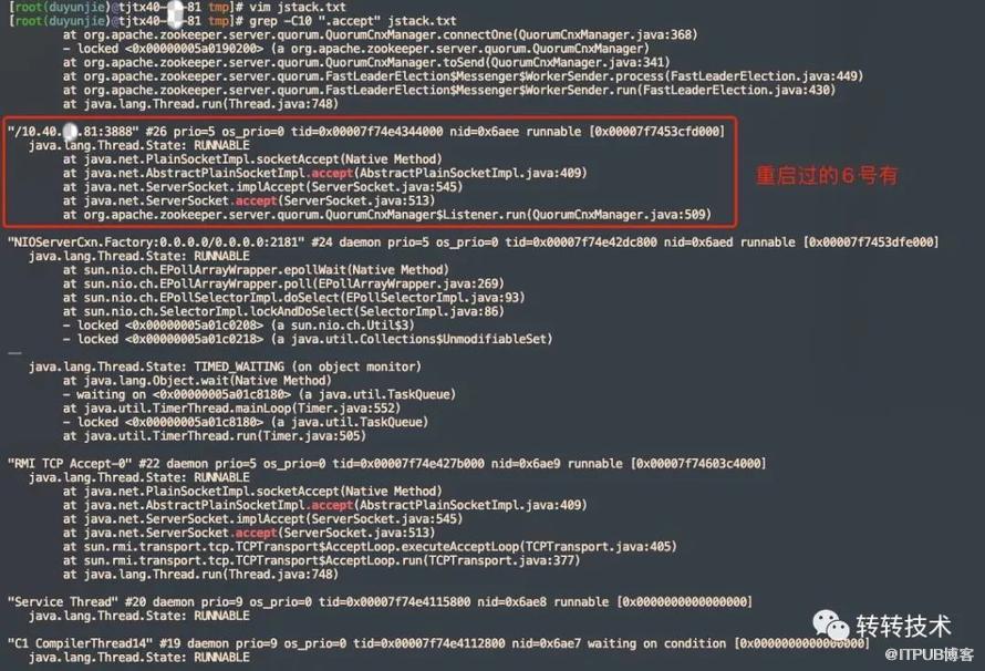 这个线程是负责监听3888端口,并accept选举请求的。我们未重启节点里这个线程都没了,怪不得不能接收6号的选举请求!!!