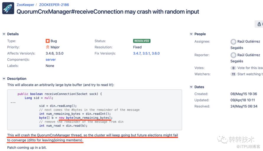 结论先行:ZK在3.4.6及以下版本存在选举端口(默认3888)失效而无法选举的重大漏洞。相关issue如下: