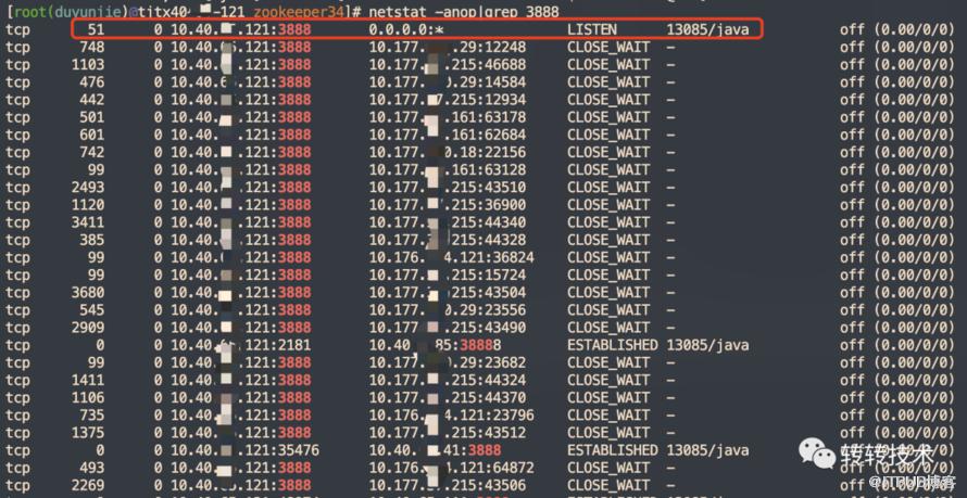 表明3888端口仍处于LISTEN的状态,并伴有大量的CLOSE_WAIT连接。大C说这些10.177开头的IP是用于安全扫描的机器,心里也在嘀咕是不是跟这个有关。