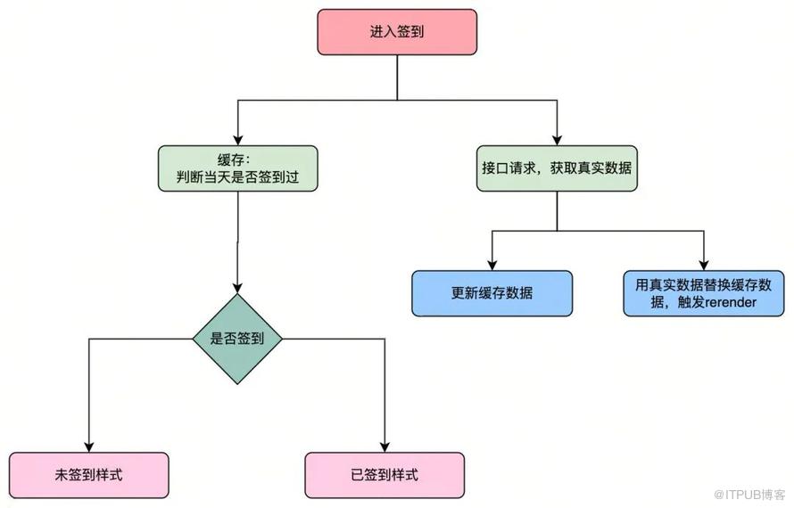缓存数据必然会先于接口响应数据,因此页面第一时间看到的肯定是缓存数据(没有缓存数据,会默认使用未签到数据)所渲染的页面,那么当接口响应完成时,需要使用真实的数据触发页面的 rerender,需要注意处理,避免造成页面闪烁。