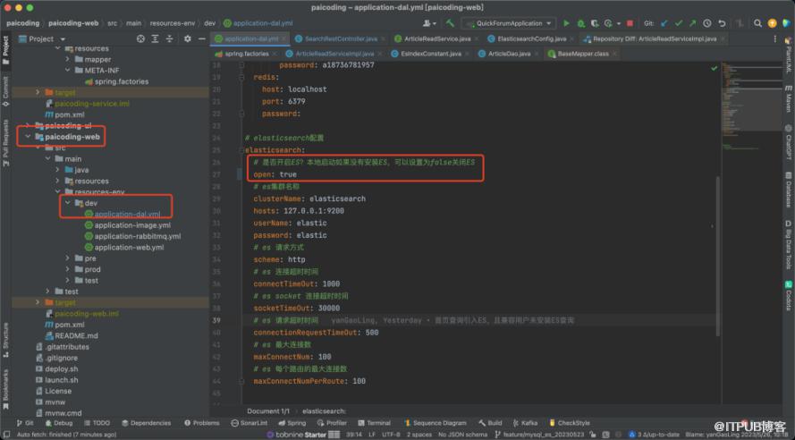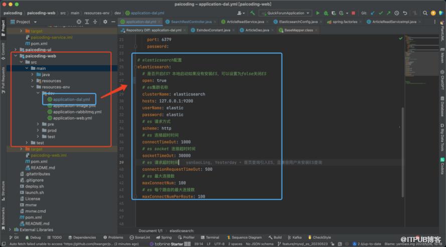 在 paicoding-web 模块中 src->main->resource-env->dev->application-dal.yml 中配置 ES 相关配置,配置如下所示: