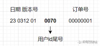 首先可以肯定一件事情,每一条订单数据一定包含一个列就是用户id,我们的问题在于知道订单id却不知道在哪个分片,那我们在订单生成规则里附加一下对应用户的id信息不就可以了嘛。比如下面的订单id生成规则: