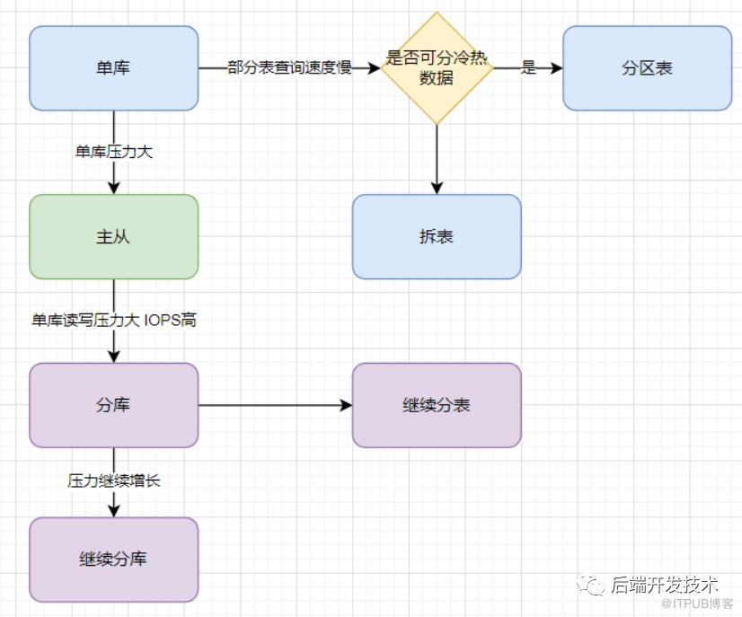 对于单表查询压力过大的问题,我们可以判断查询的数据是否可以按照创建时间区分为冷热数据,如果可以优先考虑分区表。如果查询场景复杂我们可以考虑拆表,即使是在同一个数据库中,拆表也可以有效降低索引层级,加快查询速度。但是如果是IOPS压力大,则无法很好的缓解这个问题,证明单机性能已经到了瓶颈需要进行分库。