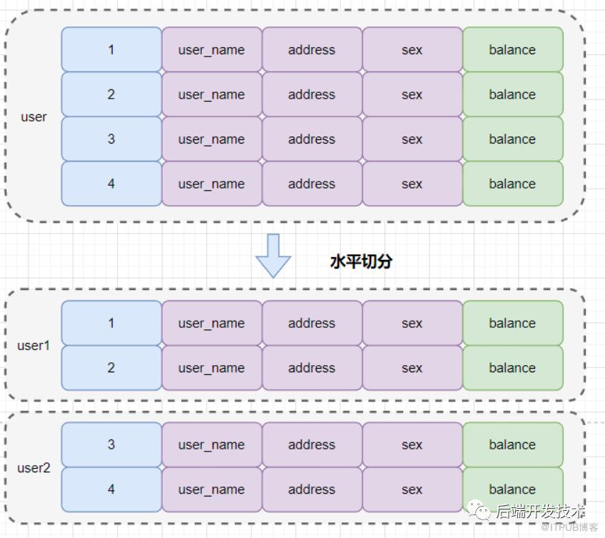简单来说,水平切分就是按照一定规则把一个表不同行拆分到不同表中。