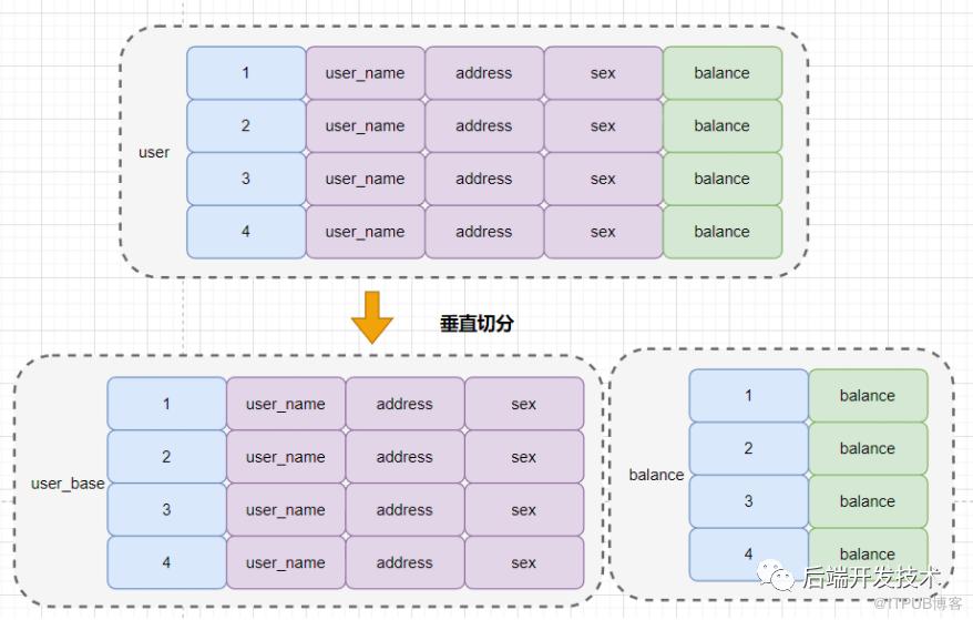 简单来说,垂直切分就是把一张表不同字段拆分到不同的表里。