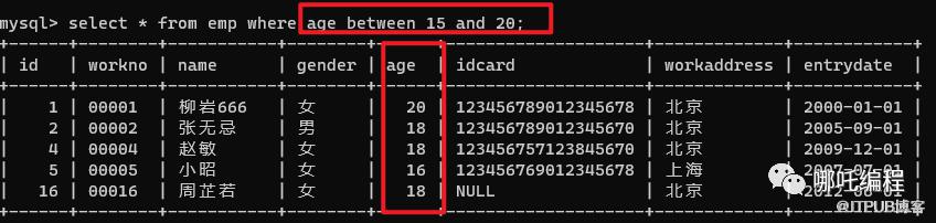 select * from emp where age >= 15 and age <= 20;