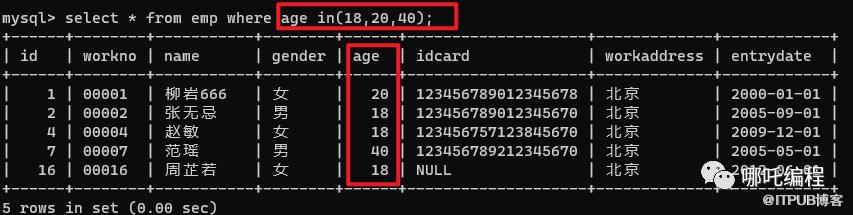 select * from emp where age in(18,20,40);