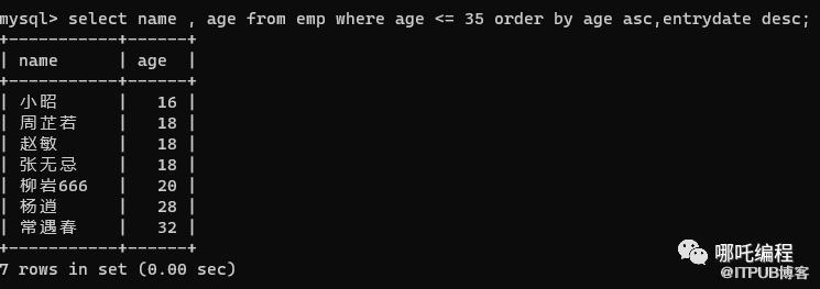 查询所有年龄小于等于35岁员工的姓名和年龄,并对查询结果按年龄升序排序,如果年龄相同按 入职时间降序排序