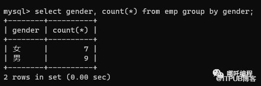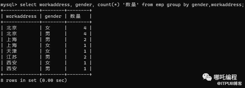 select workaddress, gender, count(*) '数量' from emp group by gender,workaddress;