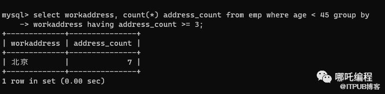 查询年龄小于45的员工 , 并根据工作地址分组 , 获取员工数量大于等于3的工作地址