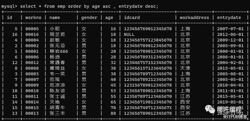 根据年龄对公司的员工进行升序排序 , 年龄相同 , 再按照入职时间进行降序排序